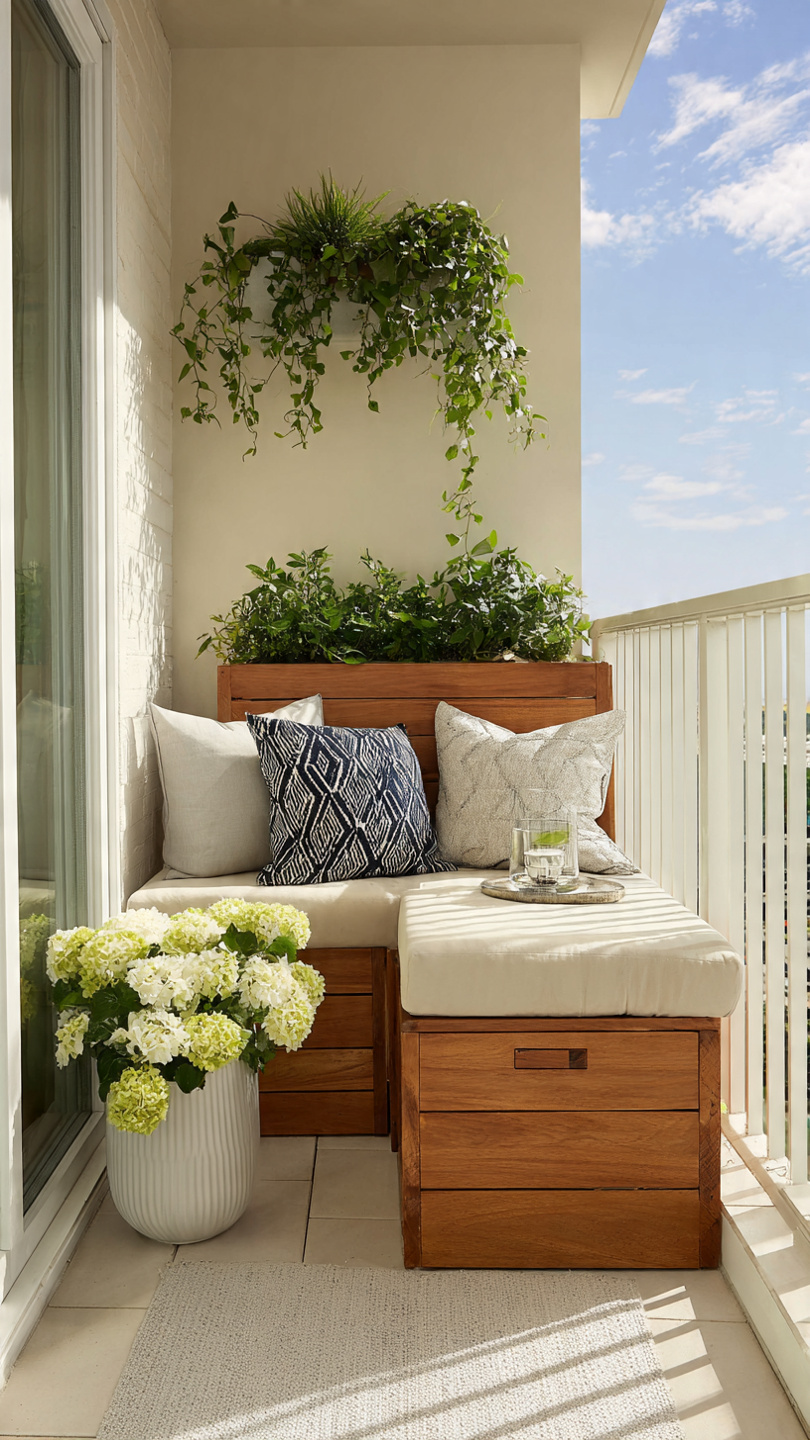 Designate a spot for outdoor furniture and decor that protects your balcony from the elements. Use a weather-resistant rug, furniture covers, and a storage bench to keep your space cozy and organized.