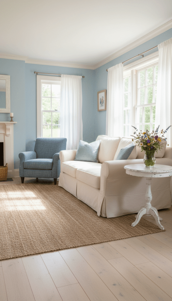 When you combine blue with natural textures, the space feels grounded, relaxed, and timeless. The contrast between cool color and warm materials is what makes blue country cottage decor so irresistible.