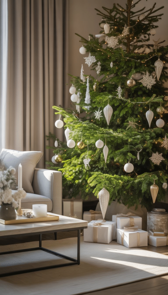 This combo feels fresh and modern. It’s perfect if you want a simple but classy Christmas tree. Metallics add a nice sparkle without being too loud.