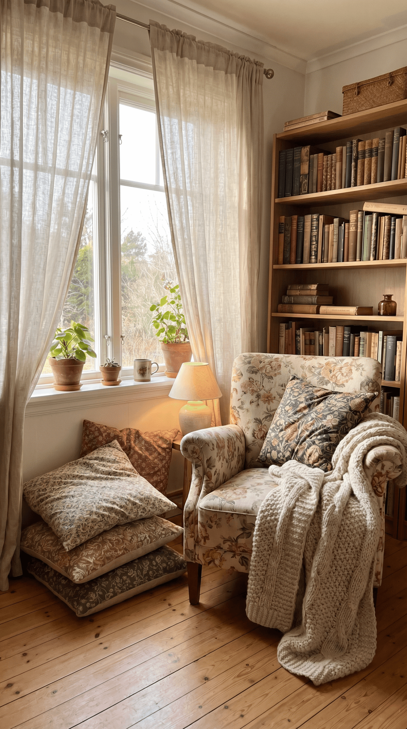 Create a little reading corner with an armchair, a floor cushion, or even a pile of pillows by the window. Add a soft throw and a small lamp so it feels like a dedicated space for slow mornings and quiet evenings. This tiny nook becomes a comforting retreat within your retreat.