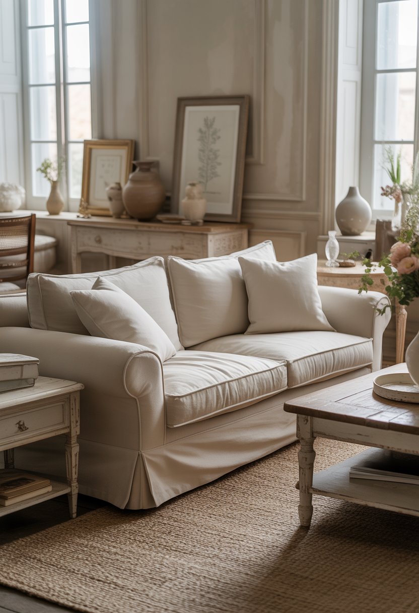 You can add a cream linen slipcovered sofa to give your living room a soft, cozy feel. It’s easy to keep clean with removable covers. This style fits well with natural wood and light colors for a calm, relaxed look.