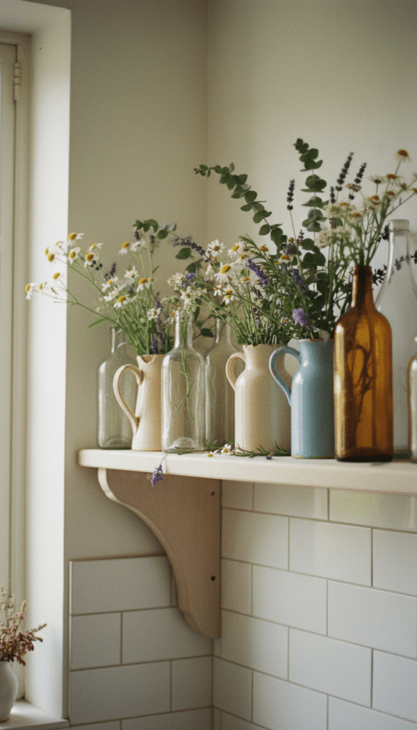 Nothing says French countryside in spring like small, casual arrangements of flowers and greenery. Skip the overly formal bouquets and instead gather delicate wildflowers, eucalyptus, or simple branches in mismatched vases and old glass bottles. Scattered throughout your home, these small touches of nature make every surface feel fresher and more alive.