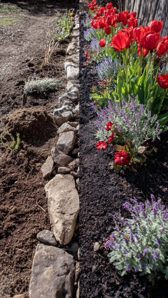 • Edge with mulch or small scalloped stones; keep a clean line where lawn meets bed.