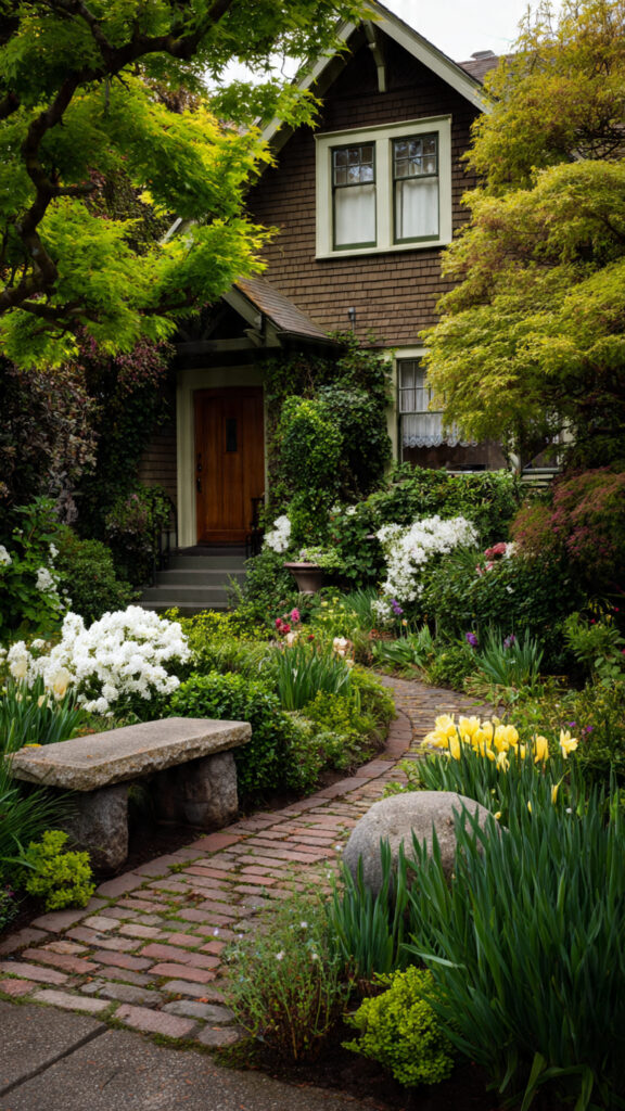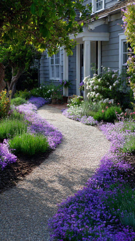 A clear route guides the eye and visitors while protecting beds. Lay pea gravel over landscape fabric, or set irregular flagstones about 18 in. apart. Line the edges with low, tough spring bloomers for texture and a hint of scent, it looks intentional and cuts down on maintenance.