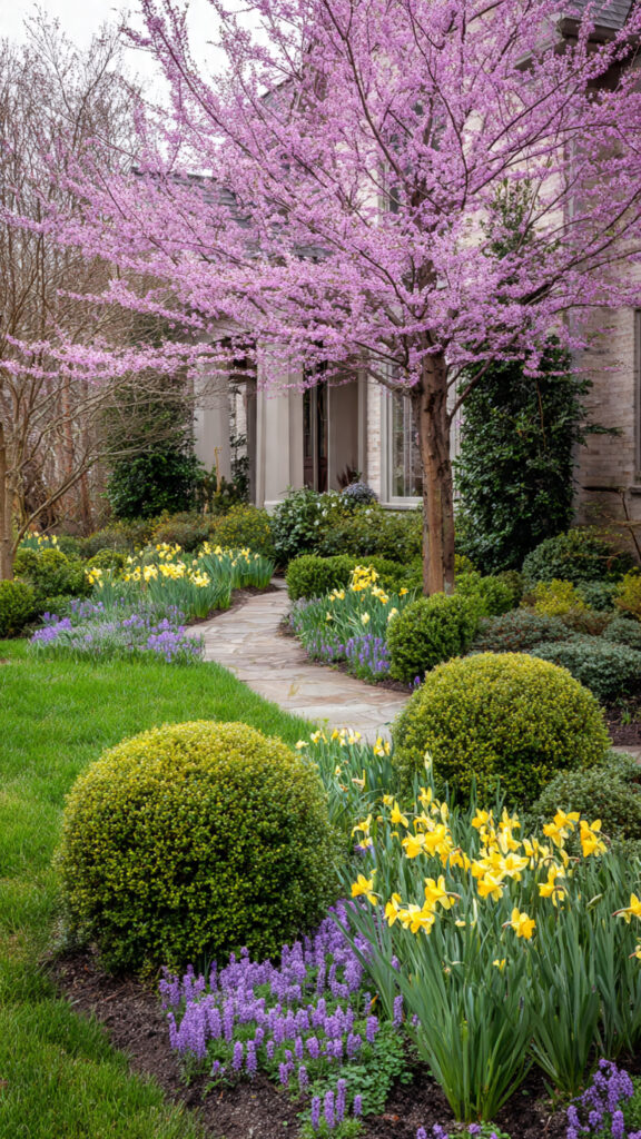 A couple of small evergreen shapes give structure year-round, so spring color has a backdrop. Plant bulbs around their bases for seasonal lift, and add one small flowering tree if you have the space, it gives height without a lot of mess.