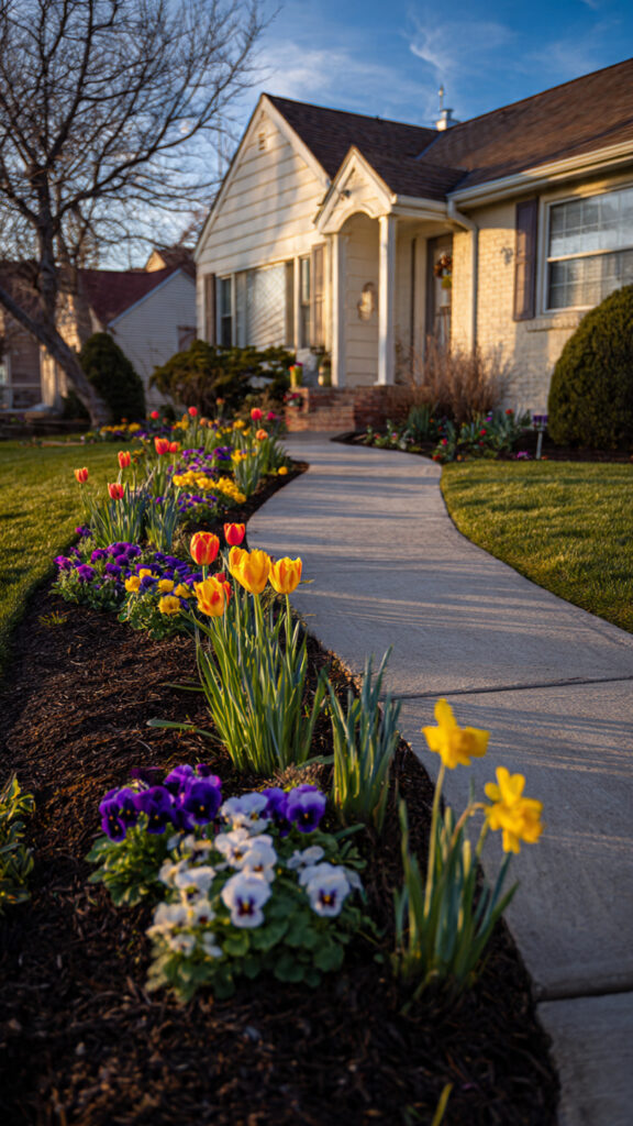 A shallow bed along your path or foundation instantly lifts curb appeal. Keep the depth modest (6–12 in.) so it’s easy to plant and maintain. Put low growers in front and taller spring blooms behind, and mirror the layout on both sides of the walk for a tidy, balanced look. Mix about 70% reliable perennials with 30% seasonal annuals so you can swap color each year.