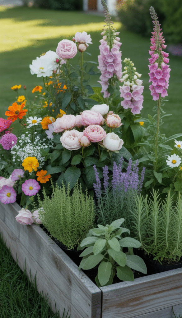 Add fragrant herbs like lavender, thyme, sage, and rosemary. They smell great, attract pollinators, and can be used in cooking. Plant your flowers and herbs in clusters or layers to look natural and spread color and scent.
