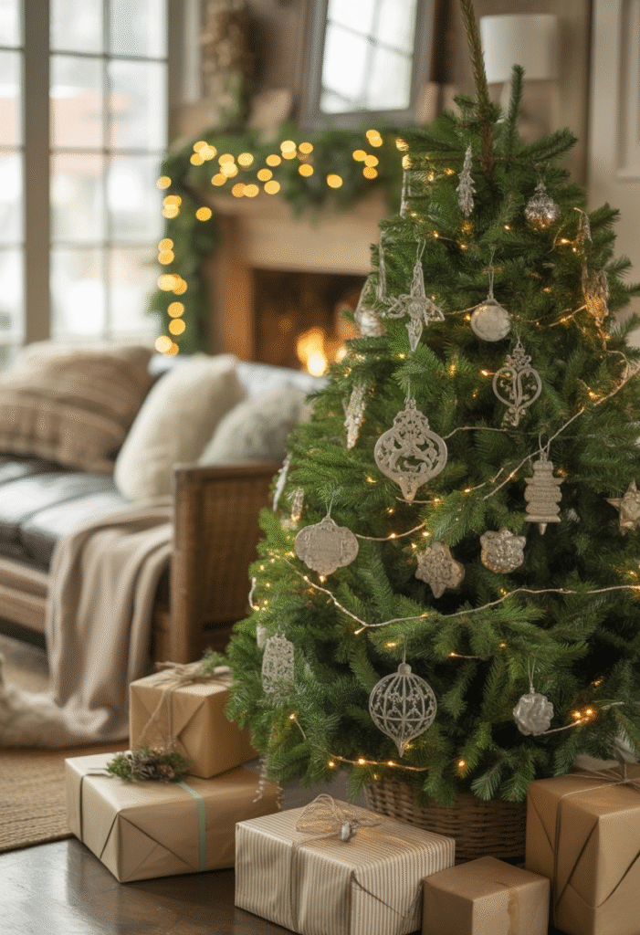 You can give your living room a cool vintage vibe by using an old metal Christmas decor items. Its worn look adds character and a bit of nostalgia. Plus, it’s a simple way to bring some retro charm without much effort. Just place on your tree or around it for a simple retro look.