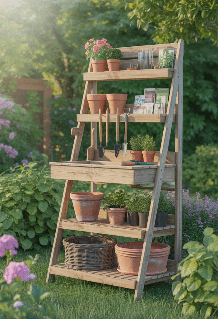 You can save space with a ladder-style potting station. It uses vertical shelves to hold pots, tools, and plants. This design makes it easy to see and reach everything without taking up much room. It’s great if you have a small garden or patio.