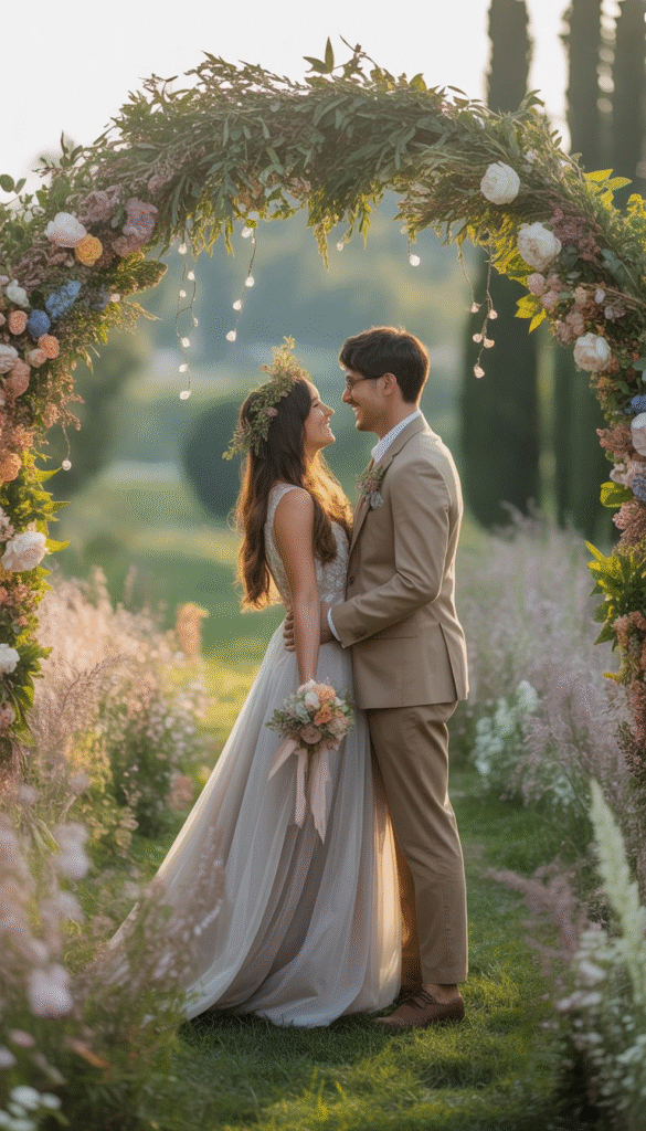 You can create a dreamy vibe with an arch wrapped in soft ivy and roses. The greenery adds a natural touch while the roses bring gentle color.