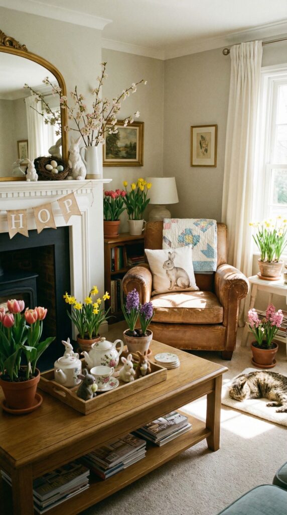 Choose two or three colors that repeat in your flowers, rug, and any artwork so the space feels pulled together instead of busy. Think soft pink and yellow, or lavender and white.