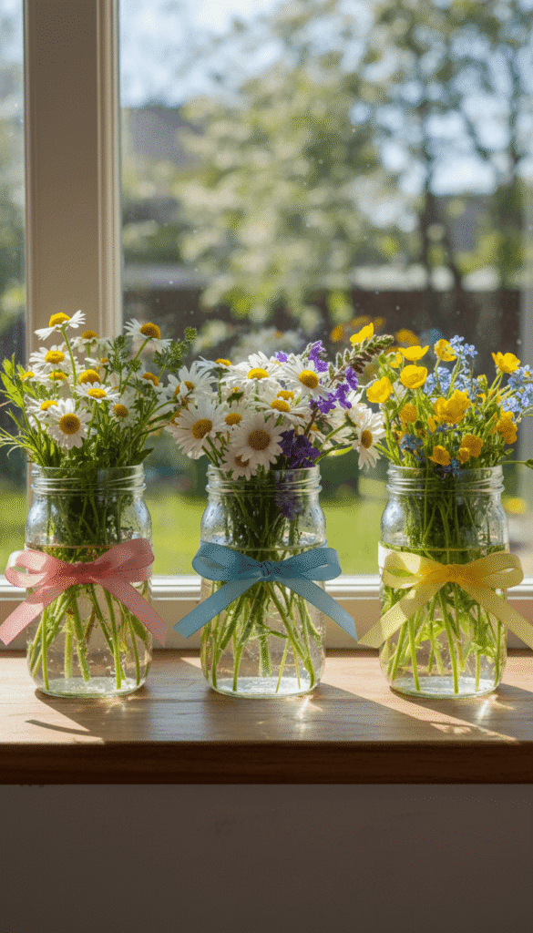 Mason jars are a spring classic, especially when filled with relaxed, wildflower-style blooms. Dressing them with simple accents keeps the look charming rather than cluttered.