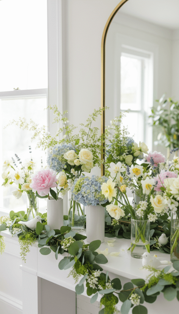 A light, seasonal garland instantly adds softness and movement to a mantel. For spring, think delicate and airy rather than dense or heavy.