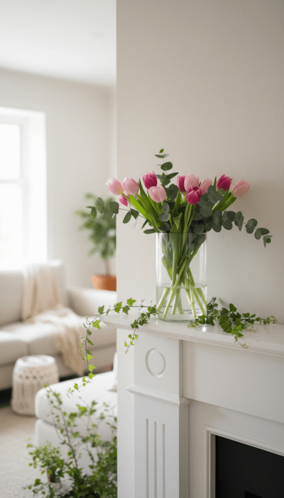 Nothing says spring like a vase of fresh flowers or a cluster of leafy stems on your mantel. Choose one simple vessel, like a clear glass cylinder or a textured ceramic pitcher, and fill it with seasonal favorites such as tulips, daffodils, or eucalyptus. The organic shapes and natural movement of the greenery instantly soften the lines of the mantel and add a sense of life and energy.
