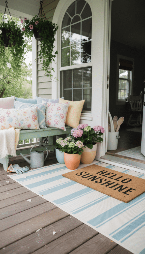 Stick to two or three main colors so your porch feels cohesive, not busy. Repeating those colors in your mat, pillows, and planters will pull everything together effortlessly.
