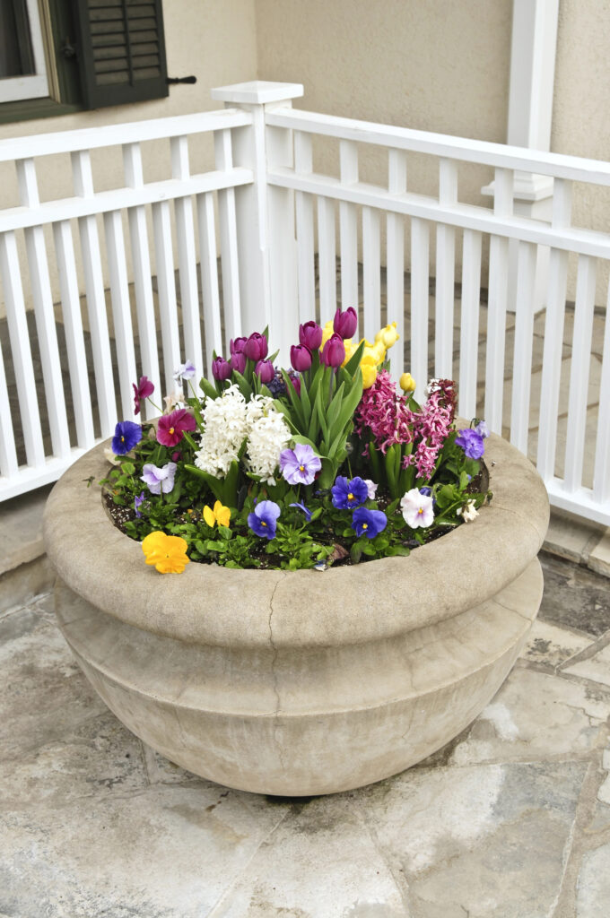 - Fill planters with a mix of greenery and seasonal blooms (think tulips, daffodils, pansies)
