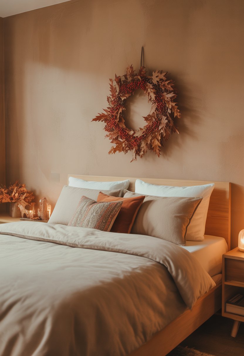 You can add a cozy fall touch by hanging a dried leaf and berry wreath above your bed. It brings in natural colors and a warm feel. This simple decor gives your room a seasonal update without much effort.