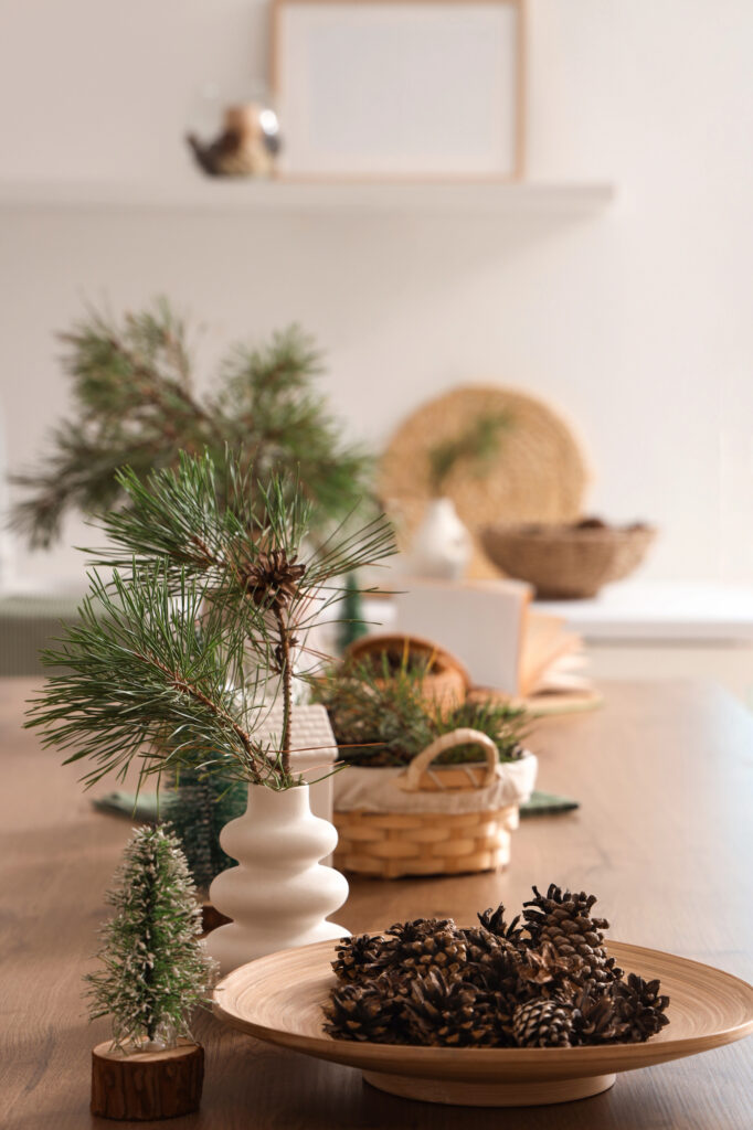 A simple bowl overflowing with pine cones can instantly transform your table into a cozy, nature-inspired focal point. This look works for everyday decor and can easily be dressed up for holidays.